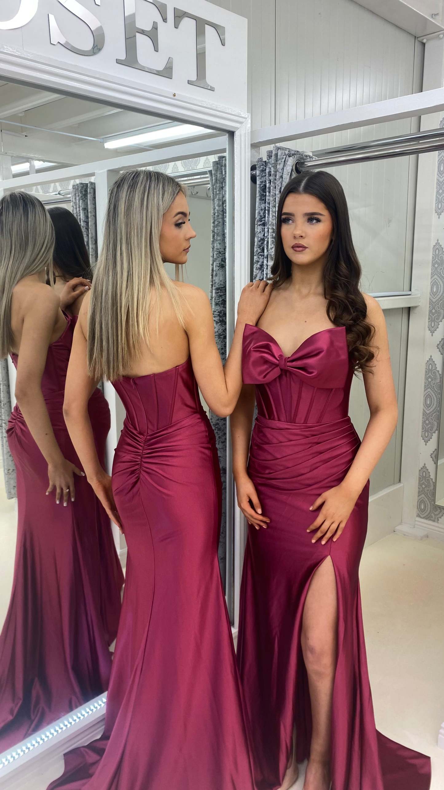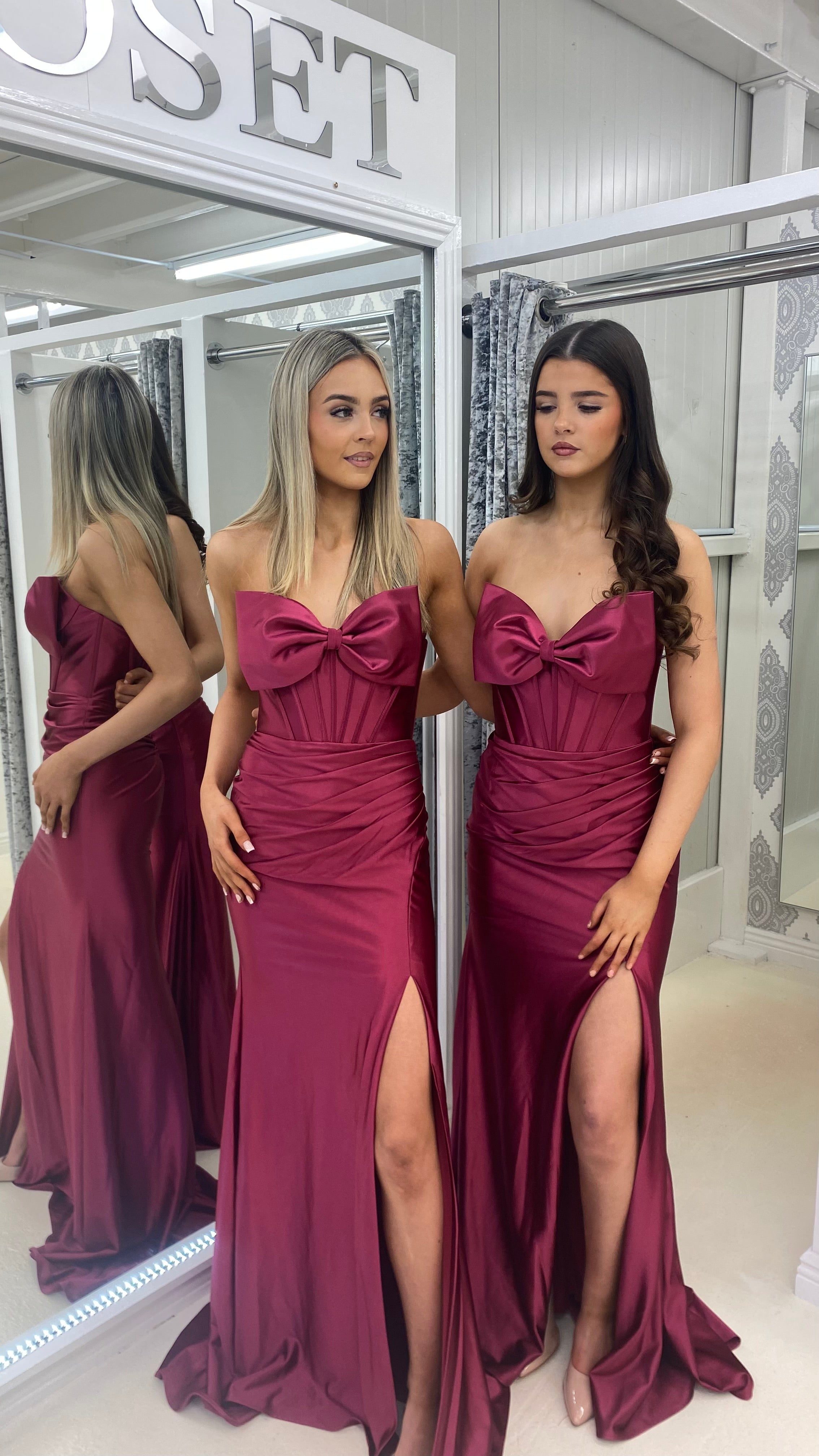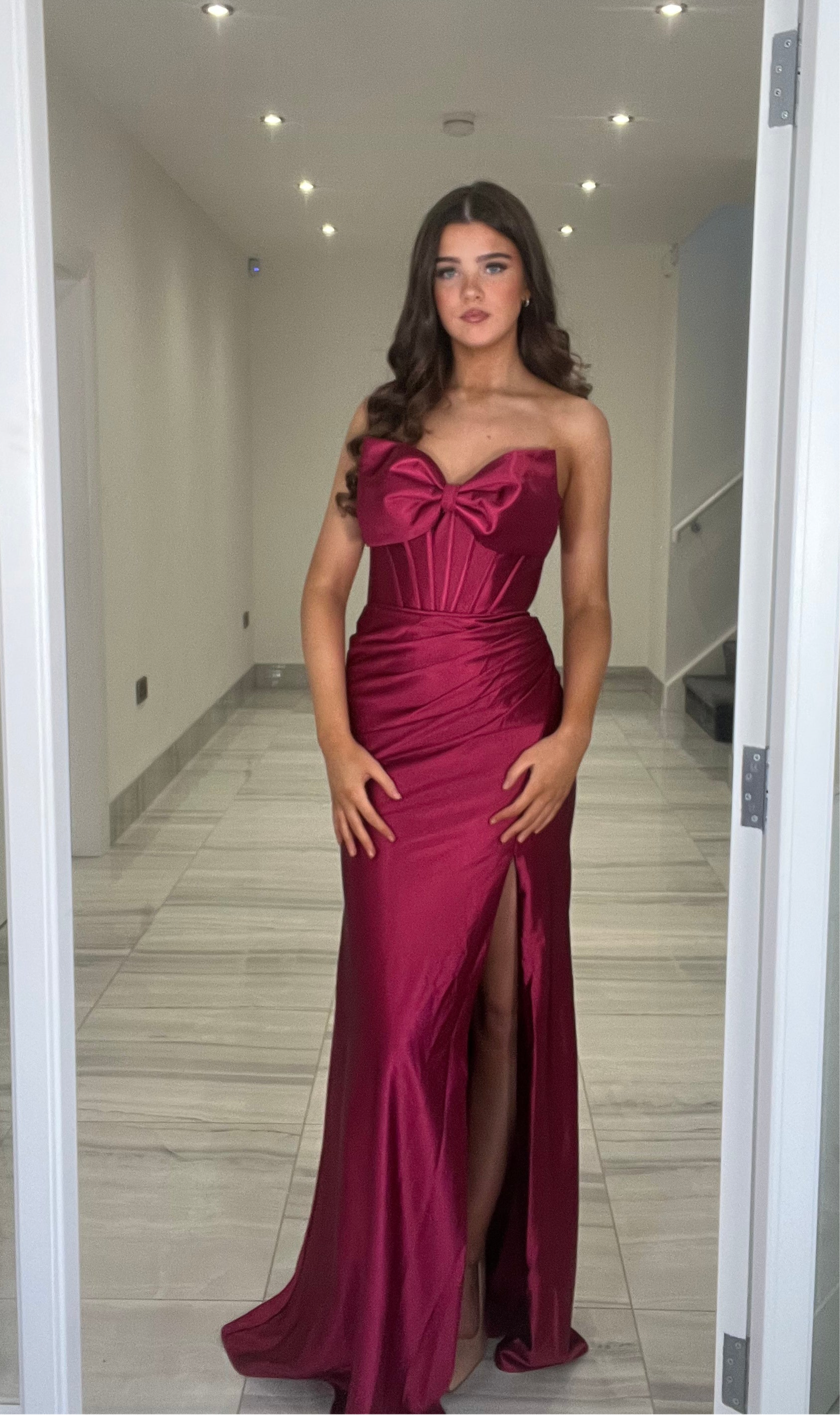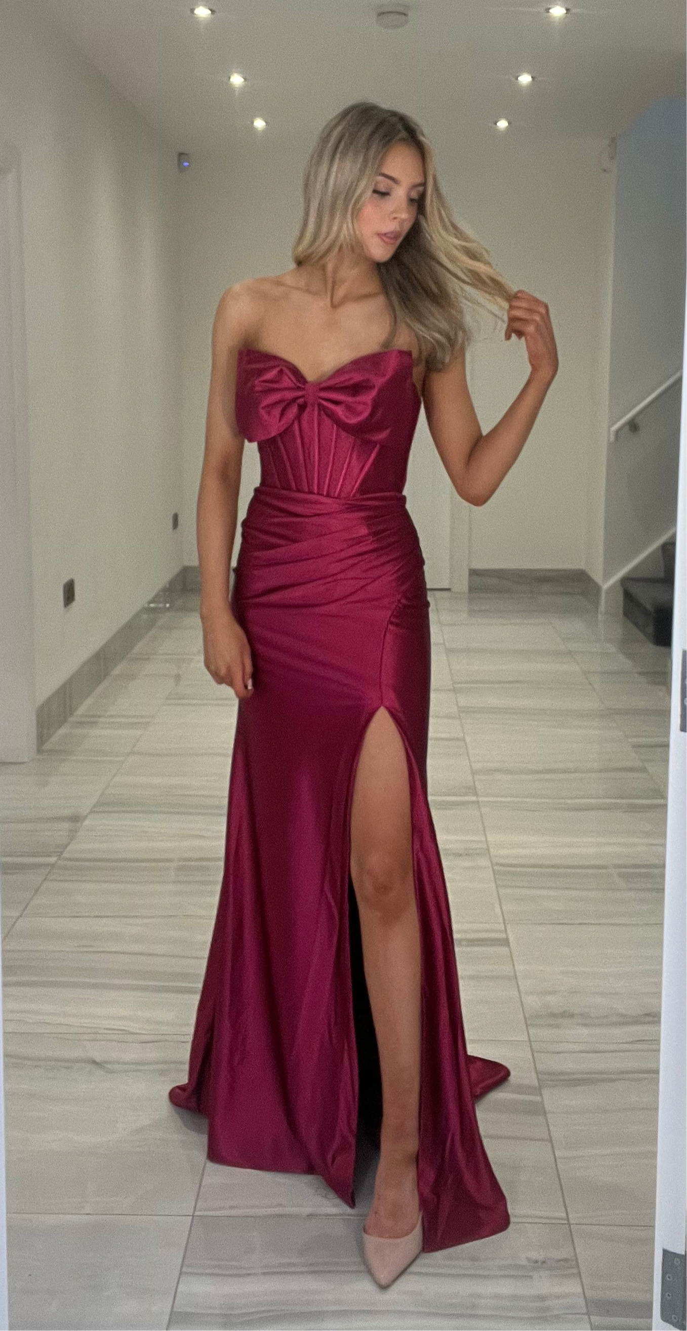 Stunning satin gown with a beautiful bow detail bandeau top.