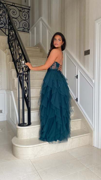Hunter Green Tiered Ruffle Skirt Corset Strapless Prom Gown